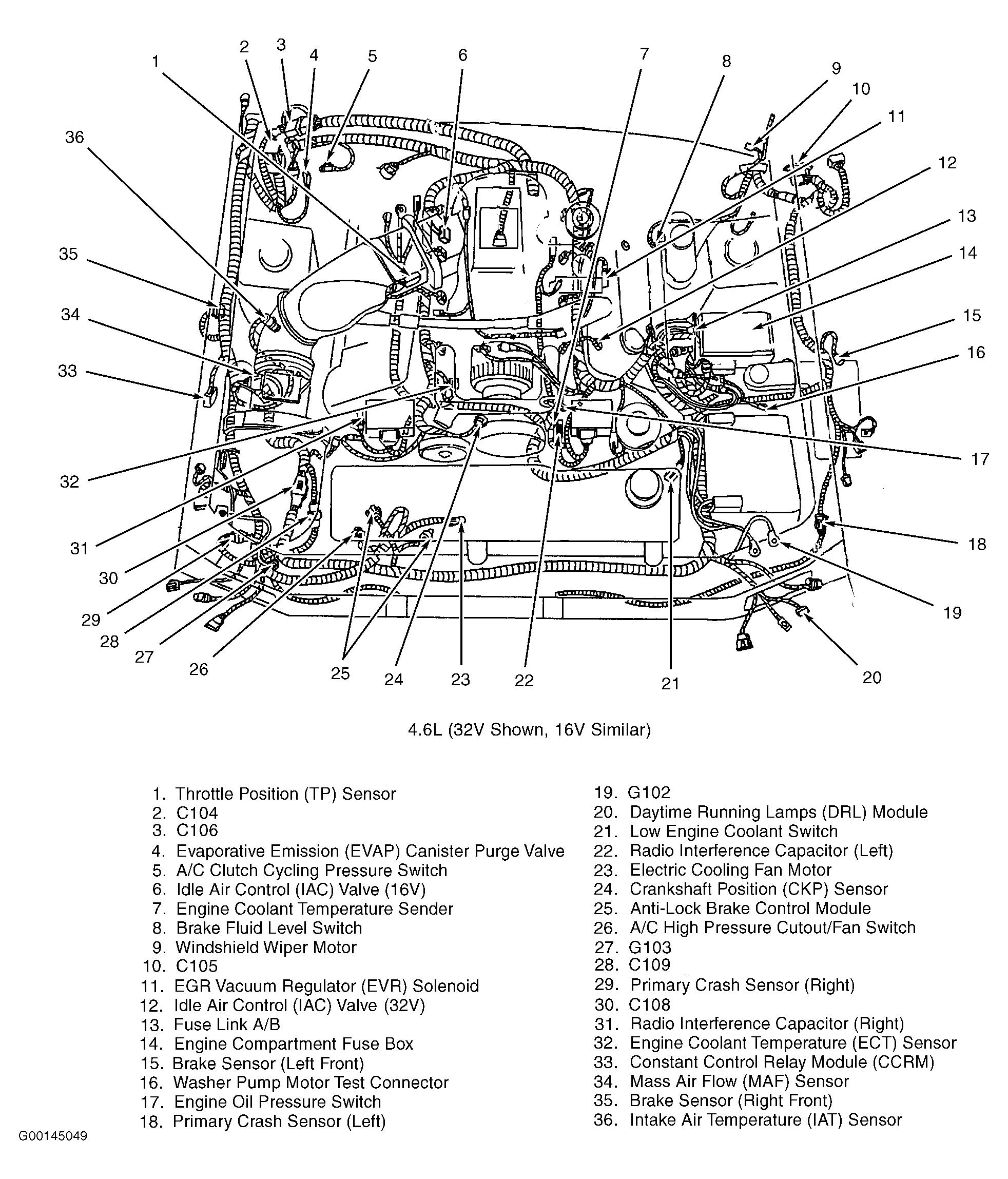 | Engine Compartment Fuse Box (4.6L) | In left side of engine compartment, forward of strut tower. See Figure. |