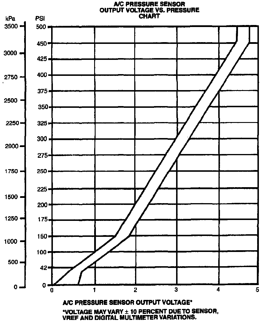 The Air Conditioning (A/C) pressure sensor is located in the high pressure (discharge) side of the air conditioning A/C system. The A/C pressure sensor provides a voltage signal to the PCM that is proportional to the A/C pressure. The PCM uses this information for A/C clutch control, fan control and idle speed control.