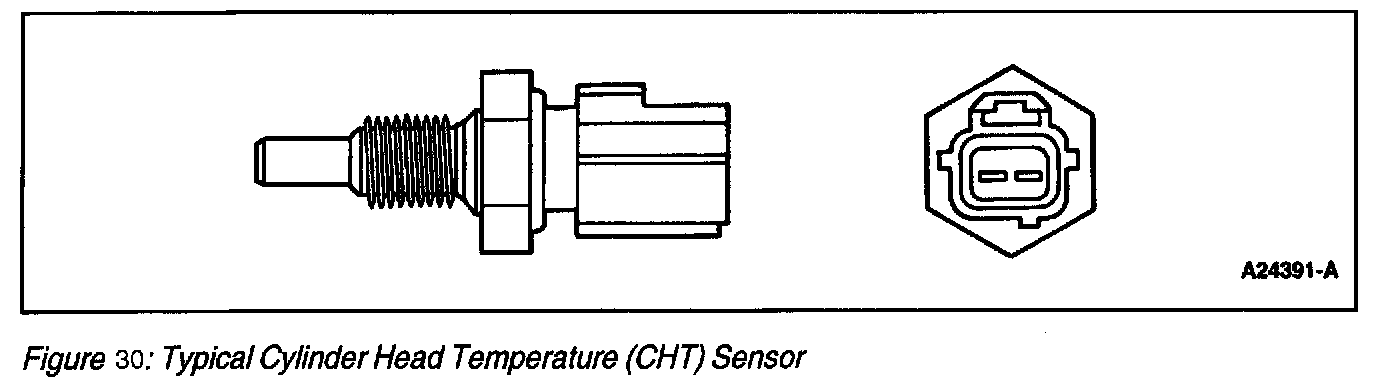 The Cylinder Head Temperature Sensor (CHT) sensor is a thermistor device in which resistance changes with temperature. The electrical resistance of a thermistor decreases as temperature increases, and increases as temperature decreases. The varying resistance affects the voltage drop across the sensor terminals and provides electrical signals to the PCM corresponding to temperature.