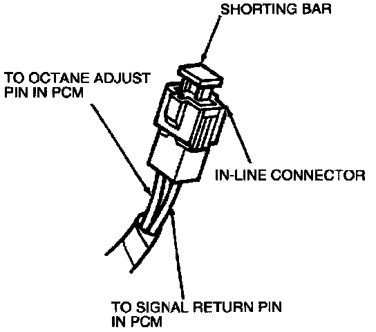 The Octane Adjust (OCT ADJ) shorting bar is used to retard spark timing. Removal of the shorting bar from the in-line connector will typically retard spark three degrees. The purpose of the OCT ADJ self-test is to check the state of the OCT ADJ shorting bar. A Diagnostic Trouble Code (DTC) will be present if the shorting bar is removed or if there is an open circuit. The OCT ADJ shorting bar is similar in shape to the SPOUT in-line connector. On some applications the power steering pressure circuit will also have a similar shorting bar connector. DO NOT remove the shorting bar unless directed by a technical service bulletin.