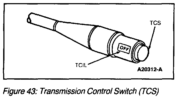 The Transmission Control Switch (TCS) signals the PCM with keypower whenever the TCS is pressed. On vehicles with this feature, the transmission control indicator lamp lights when the TCS is cycled to disengage overdrive. The operator of the vehicle controls the position of the TCS.