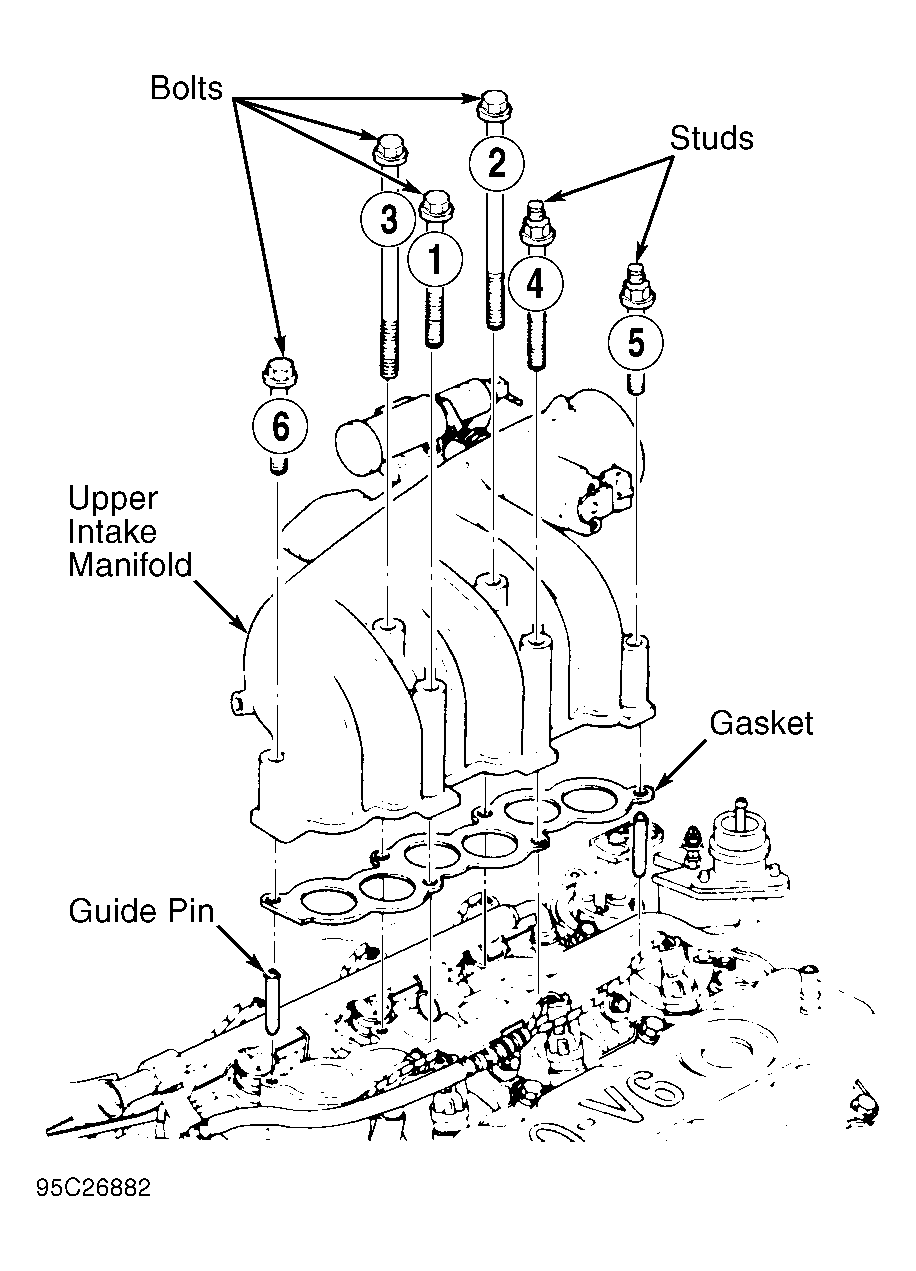 Clean gasket mating surfaces, using caution not to gouge plastic or aluminum parts. Install a NEW gasket. Use guide pins and install upper intake manifold. Tighten bolts in sequence to specification. See Fig 1 . See TORQUE SPECIFICATIONS . To complete installation, reverse removal procedure.