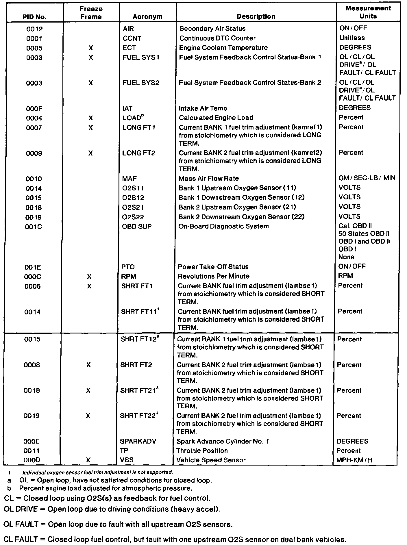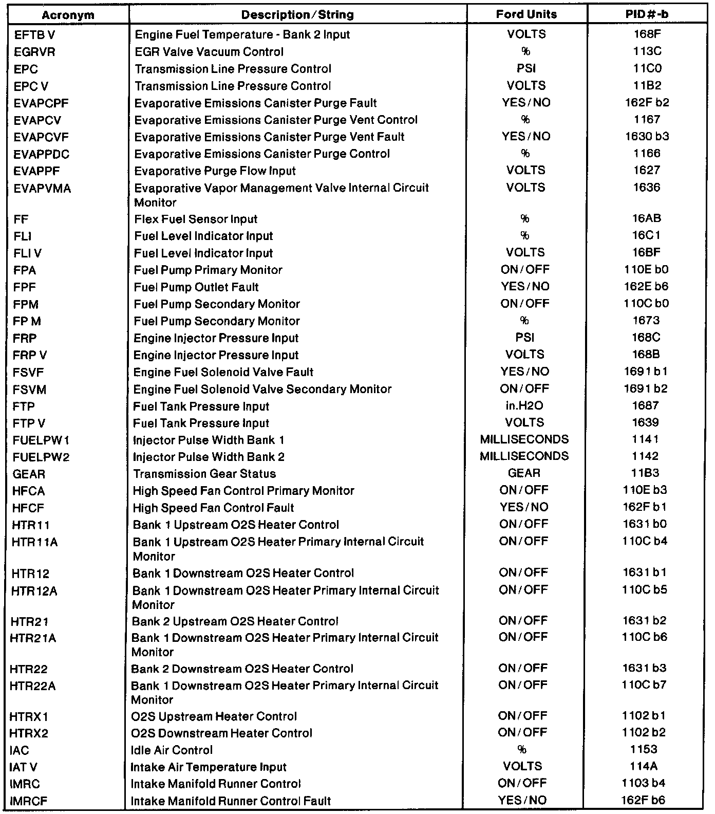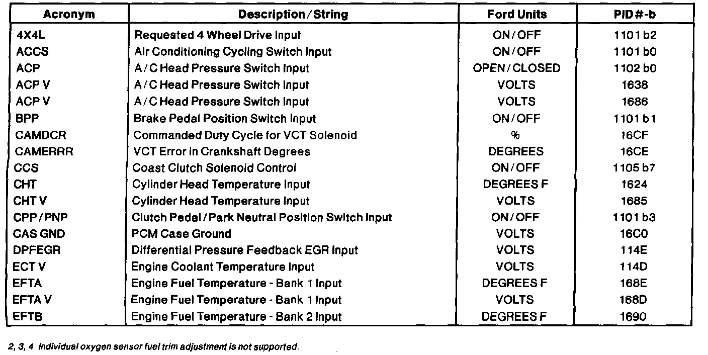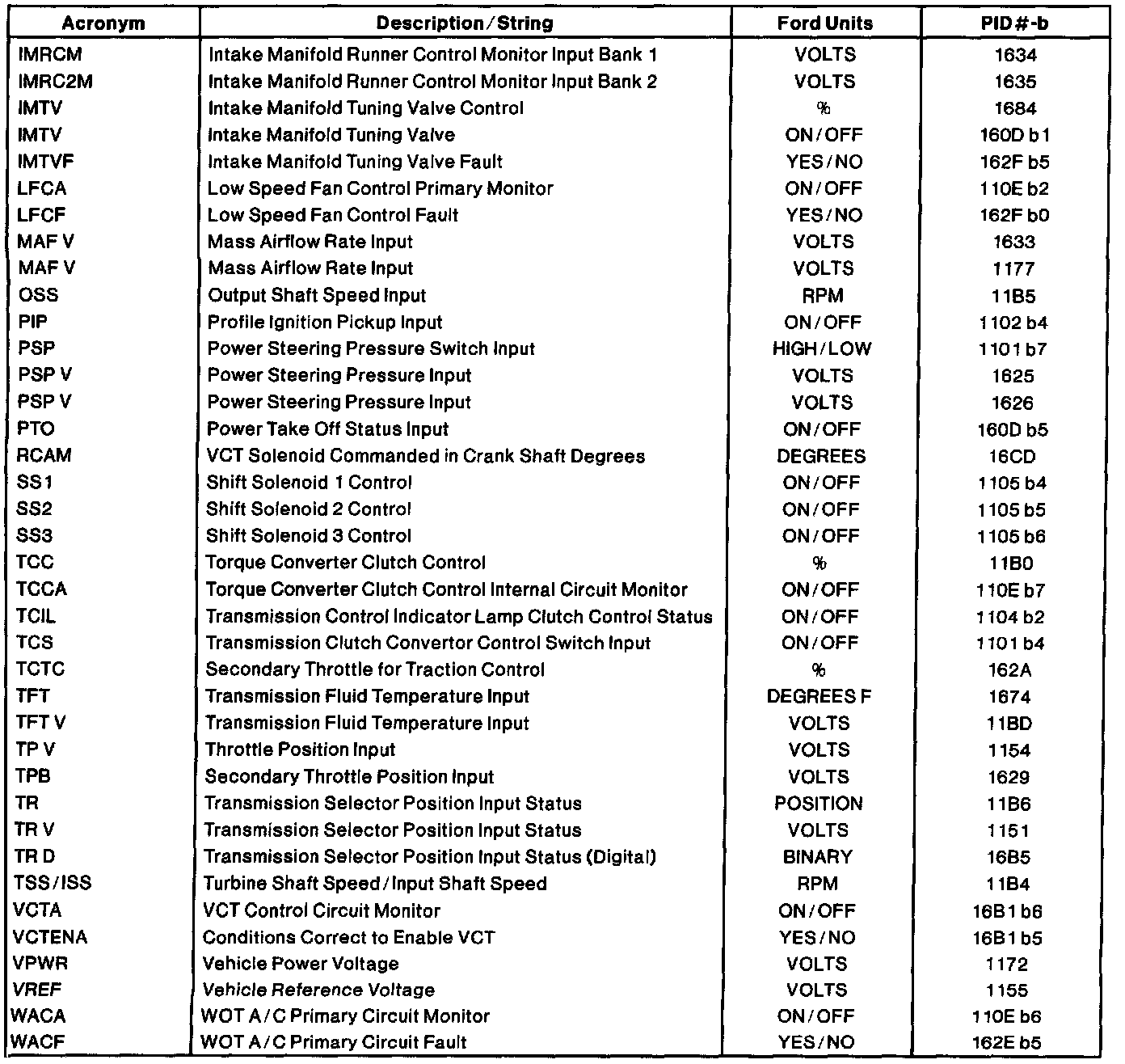 The Parameter Identification (PID) mode allows access to Powertrain Control Module (PCM) information. This includes analog and digital signal inputs and outputs along with calculated values and system status. There are two types of PID lists available and both are used throughout this manual. The first is the Generic OBD II PID list. This is a standard set of PIDs for all manufacturers all scan tools must be able to access. The second is a Ford specific list which can be accessed by the New Generation STAR (NGS) scan tool or equivalent. When accessing any of these PIDs, the values will be continuously updated. The Generic or Ford PID list provides definitions and values in appropriate units. For more information, refer to the Society of Automotive Engineers (SAE) J2205 document.