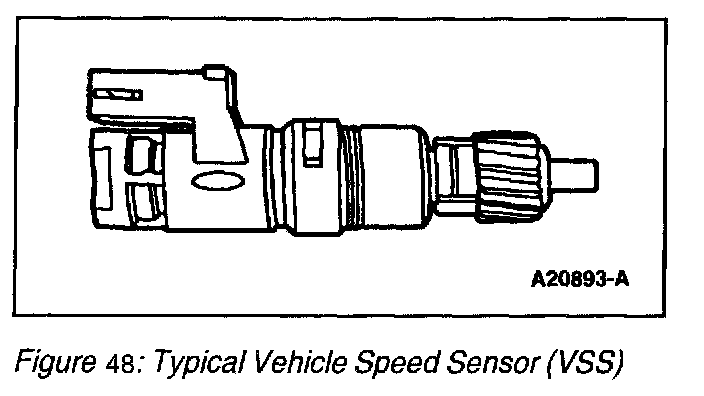 The Vehicle Speed Sensor (VSS) is a variable reluctance or Hall-effect sensor that generates a waveform with a frequency that is proportional to the speed of the vehicle. If the vehicle is moving at a relatively low velocity, the sensor produces a signal with a low frequency. As the vehicle velocity increases, the sensor generates a signal with a higher frequency. The PCM uses the frequency signal generated by the VSS (and other inputs) to control such parameters as fuel injection, ignition control, transmission/transaxle shift scheduling and torque converter clutch scheduling.