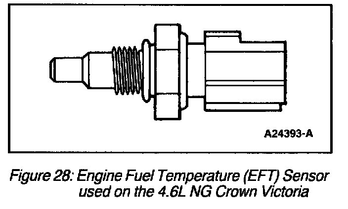 The EFT sensor measures the temperature of the fuel near the fuel injectors. This signal is used by the PCM to adjust the fuel injector pulse width and meter fuel to each engine combustion cylinder.