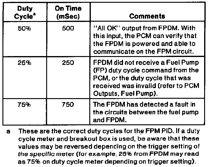 The Fuel Pump Driver Module (FPDM) communicates diagnostic information to the PCM through the FPM circuit. This information is sent by the FPDM as a duty cycle signal. The three duty cycle signals that may be sent are listed in the table.