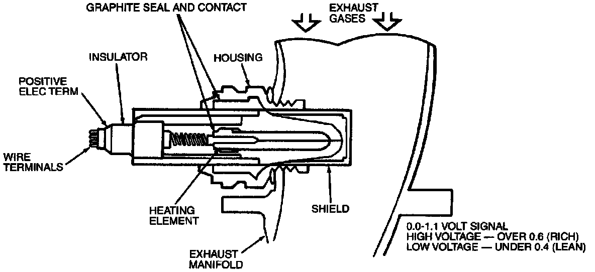 The Heated Oxygen Sensor (HO2S) detects the presence of oxygen in the exhaust and produces a variable voltage according to the amount of oxygen detected. A high concentration of oxygen (lean air/fuel ratio) in the exhaust produces a low voltage signal less than 0.4 volt, A low concentration of oxygen (rich air/fuel ratio) produces a high voltage signal greater than 0.6 volt. The HO2S provides feedback to the PCM indicating air/fuel ratio in order to achieve a near stoichiometric air/fuel ratio of 14.7:1 during closed loop engine operation. The HO2S generates a voltage between 0.0 and 1.1 volts.