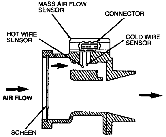 The Mass Air Flow (MAF) sensor uses a hot wire sensing element to measure the amount of air entering the engine. Air passing over the hot wire causes it to cool. This hot wire is maintained at 200°C (392°F) above ambient temperature as measured by a constant cold wire. If the hot wire electronic sensing element must be replaced. then the entire assembly must be replaced. Replacing only the element may change the air flow calibration.