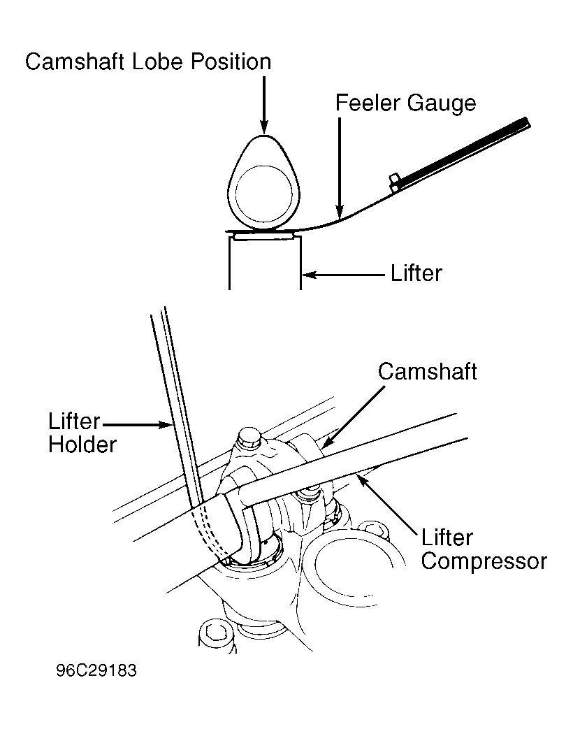 Application In. (mm) Intake .006-.010 (0.15-0.25) Exhaust .010-.014 (0.25-0.35) (1) Clearance is checked with engine cold. - To remove shim, insert lifter compressor (T89P-6500-A) between camshaft and tappet. See Fig 1 . Rotate lifter compressor to compress valve spring. Insert lifter holder (T96P-6500-AH) between camshaft and tappet bucket.
