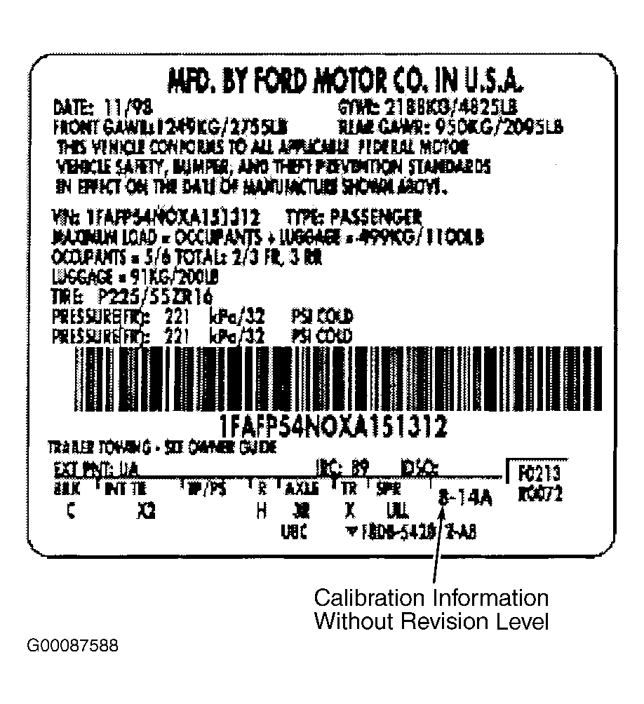 Vacuum diagrams are identified by calibration code. Use the Vehicle Certification Label to identify calibration. Base calibration information is located at lower right corner of Vehicle Certification Label. Beginning in 1999, Ford Motor Co. is no longer printing revision level on label. Revision information can be located by contacting an authorized Ford dealer. Vehicle Certification Label is attached to left door or left door pillar. See Fig 1 .