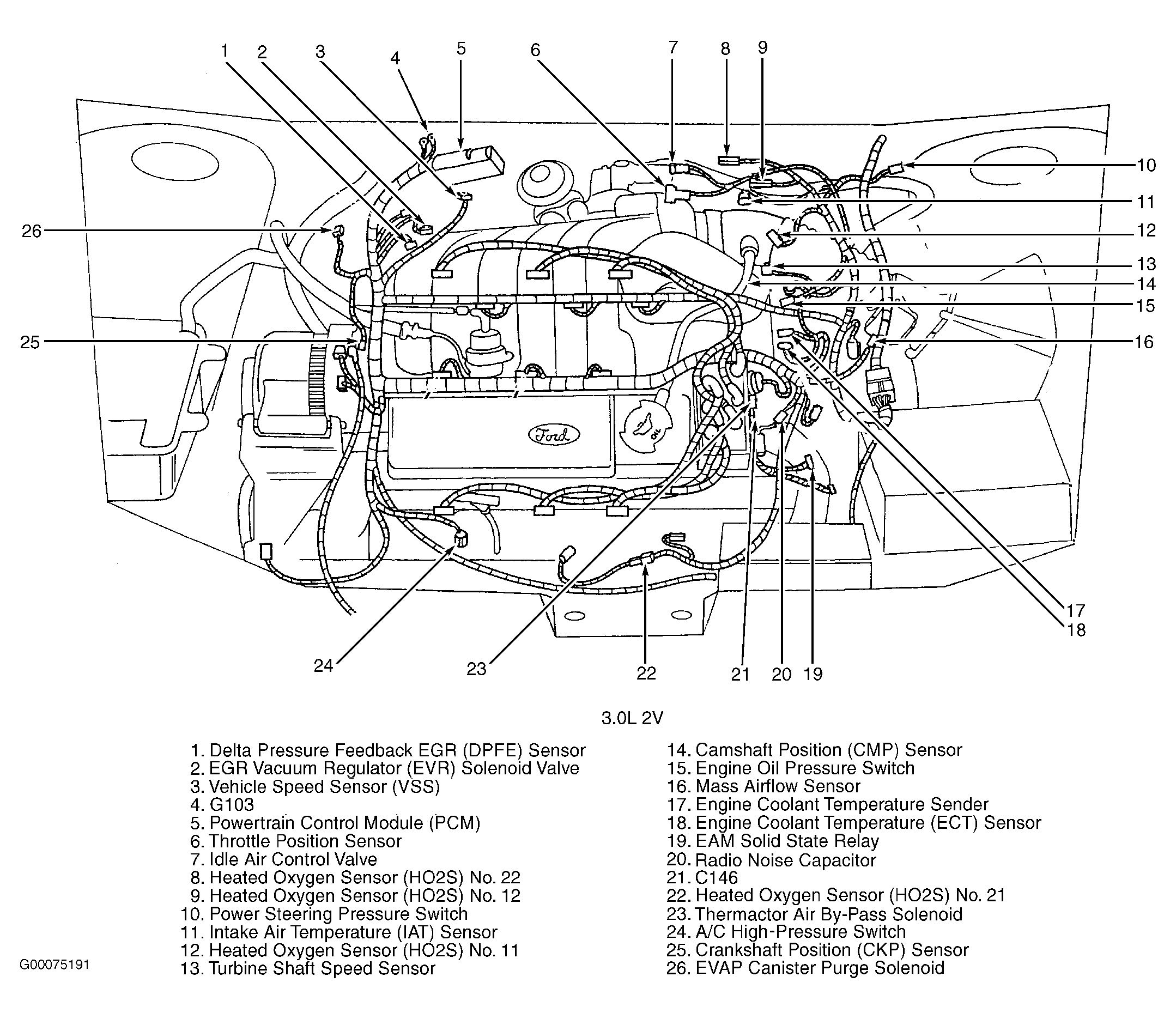 Powertrain Control Module (PCM) (3.0L 2V) Right rear corner of engine compartment, mounted in firewall. See Figure .