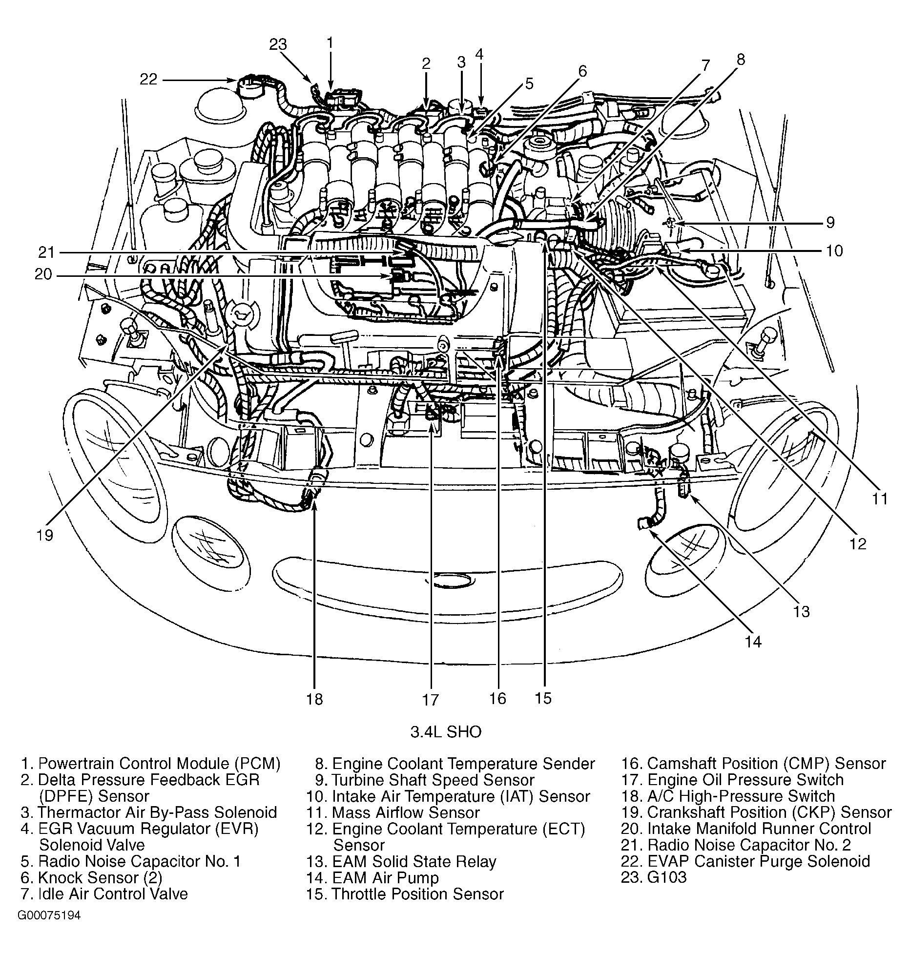 Powertrain Control Module (PCM) (3.4L SHO) Right rear corner of engine compartment, mounted in firewall. See Figure .
