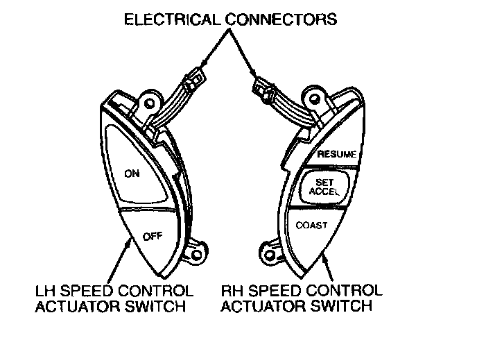 2. Disconnect connectors for LH and RH speed control actuator switches by depressing locking tang and pulling switch printed circuit and connector end out of electrical socket in steering wheel.