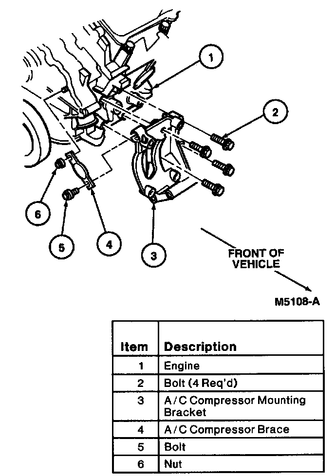 6. Remove four bolts retaining A/C compressor mounting bracket to engine.