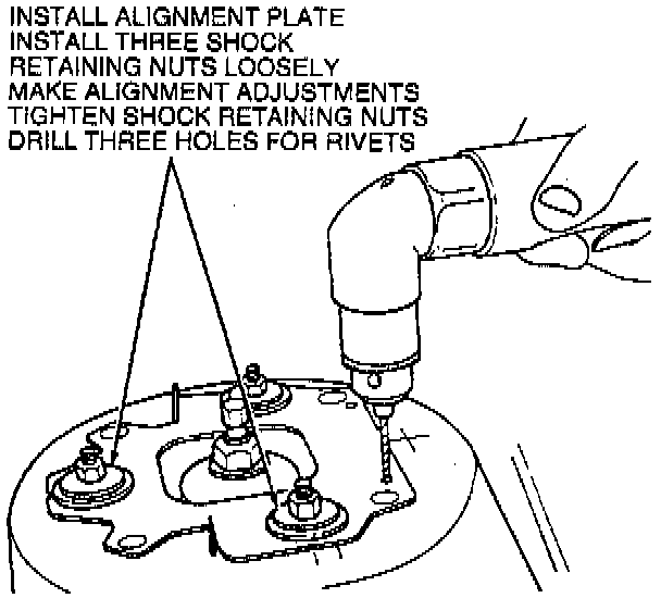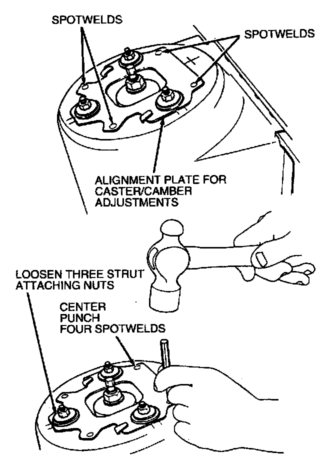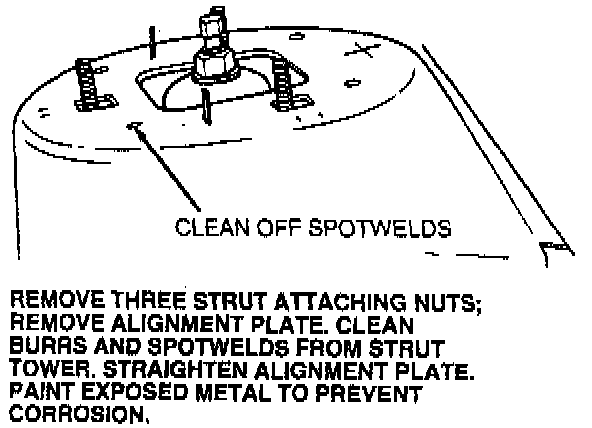 REMOVE THREE STRUT ATTACHING NUTS REMOVE ALIGNMENT PLATE. CLEAN BURRS AND SPOT WELDS FROM STRUT TOWER. STRAIGHTEN ALIGNMENT PLATE PAINT EXPOSED METAL TO PREVENT CORROSION.