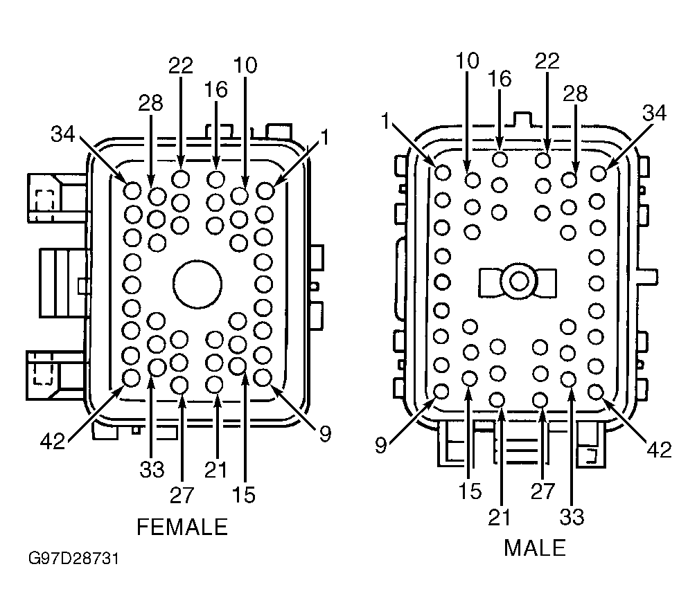 - Disconnect in-line harness connector C3001. Measure resistance between terminal No. 2 (Gray wire without ABS; Gray/Violet wire with ABS) at DLC and terminal No. 4 (Gray wire) at in-line harness connector C3001. See Figure and Figure . If resistance is less than 5 ohms, repair open in Tan/Orange wire between in-line harness connector C4112 and in-line harness connector C3001. If resistance is not less than 5 ohms, repair open in Gray wire (without ABS) or Gray/Violet wire (with ABS) between in-line harness connector C3001 and DLC. Check system for normal operation.