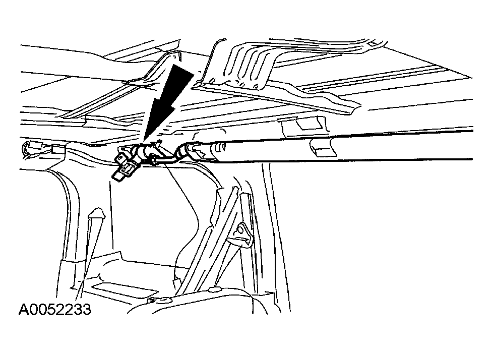 - If reusing the same safety canopy, route the A-pillar tether through the pin-type retainer. If a new safety canopy is being installed, install the A-pillar tether and pin-type retainer to the A-pillar.
