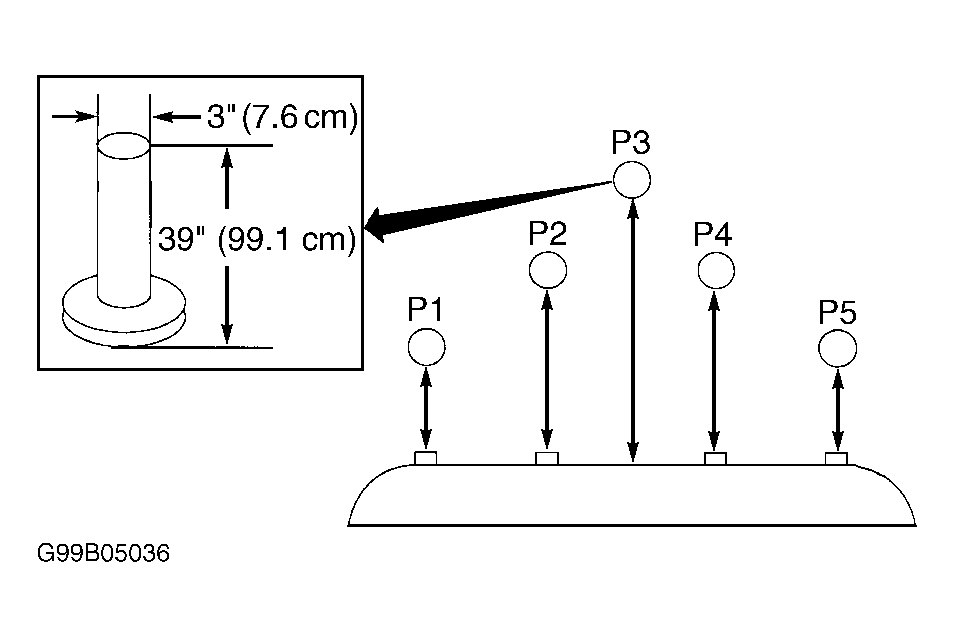 Object used in this system check can be fabricated from a 3" diameter pipe 39" in length. See Fig 1. Azimuth (side-to-side) system check should be performed with vehicle on a level surface. Parking aid module will default to ON when ignition key is turned from LOCK to RUN position.
