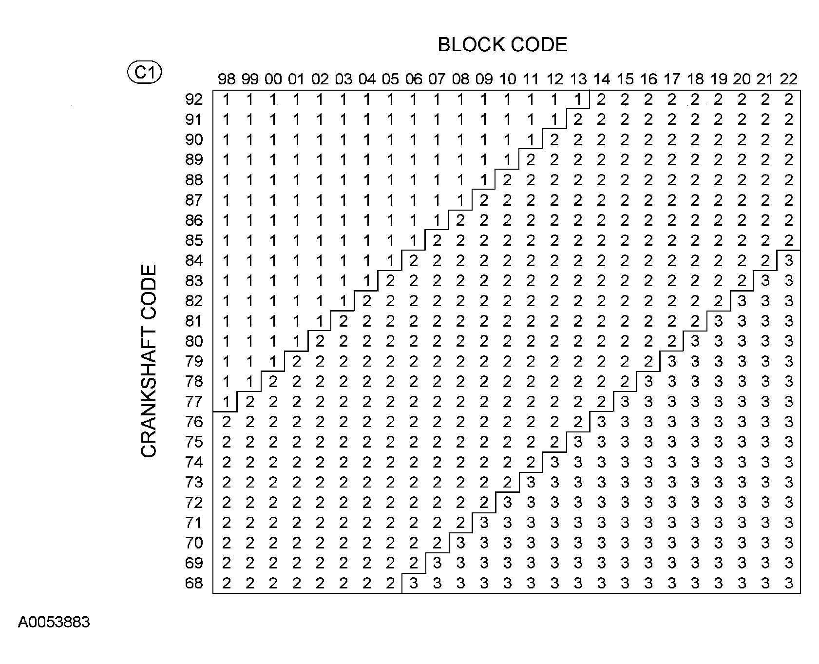 - Using the chart shown in Fig 5, choose a bearing for each main. Match the block and crankshaft code with its corresponding column or row, by reading across the "crankshaft" row and down the "block" column.