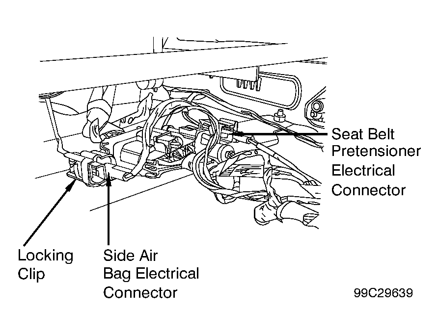 - Slide and disengage right side air bag electrical connector locking clip. See Figure . Push in to release tab and disconnect right side air bag electrical connector. Install Air Bag Simulator (418-133) on harness side of right side air bag connector. On all models, disconnect right seat belt pretensioner electrical connector. Install Air Bag Simulator (501-097) on harness side of right seat belt pretensioner electrical connector.