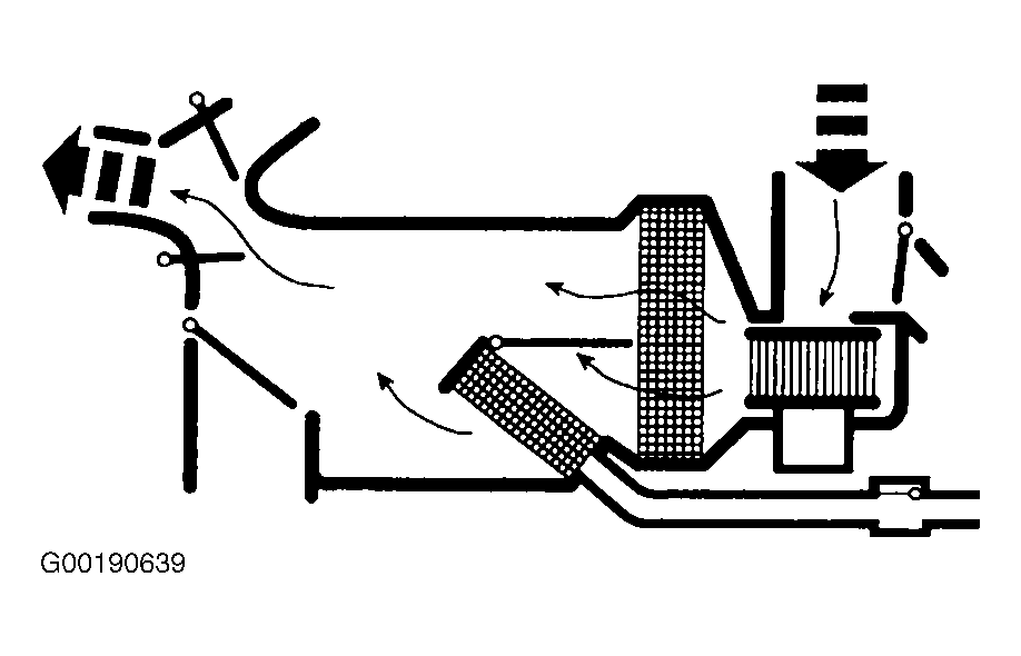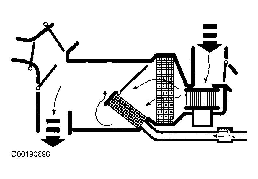 When function selector knob is in maximum A/C position, air inlet blend door is at full vacuum, closing off outside air and allowing only recirculated air. See Fig 1. Defrost blend door is at full vacuum while footwell blend door is at no vacuum, closing both doors. Vent/register blend door is at partial vacuum, directing airflow to driver side, passenger side and center registers. Temperature control is usually set for maximum cold but may be heated if selected. Air is picked up at recirculation opening by blower motor. With temperature control set for maximum cold, air flows across evaporator core, diverting past heater core and then directed into passenger compartment through driver side, passenger side and center registers. Compressor is enabled when MAX A/C is selected. Blower motor is on.