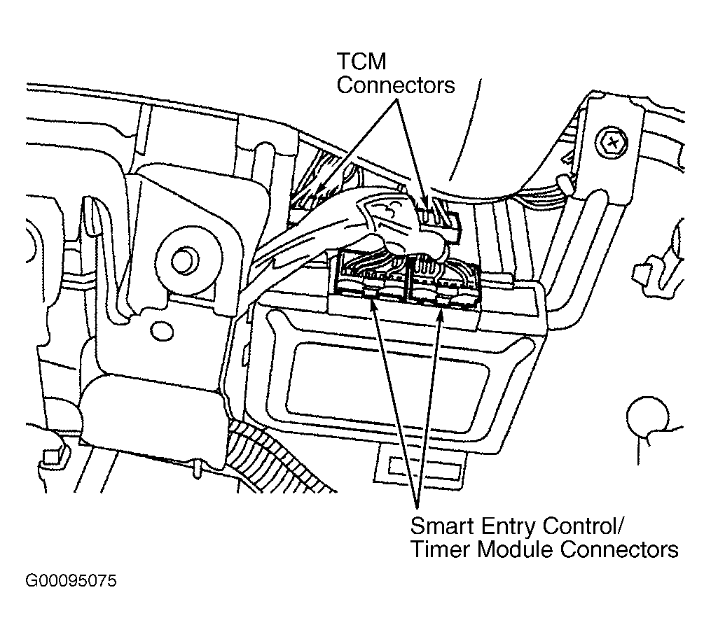 - Disconnect negative battery cable. Locate TCM behind instrument cluster, to right side of steering column. Disconnect smart entry control timer module connectors. Disconnect TCM harness connectors. See Fig 1 .