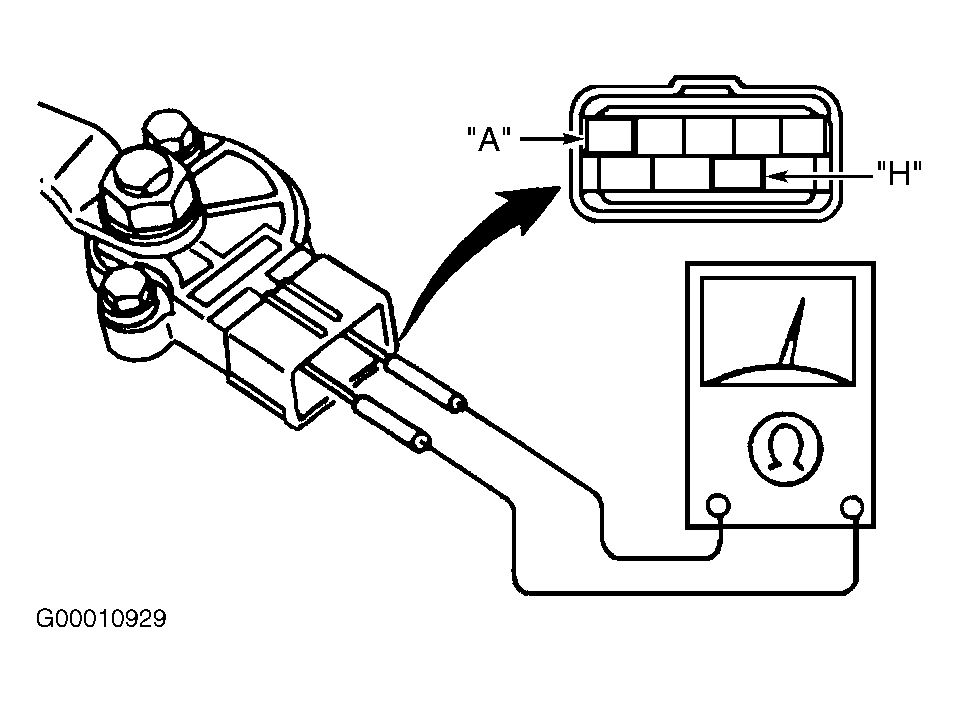2. Connect an ohmmeter between TR sensor terminals "A" and "H". See Fig 1 . Rotate sensor to point where there is no continuity between terminals. While holding sensor in place, tighten bolts. Disconnect ohmmeter. Install sensor connector. Install shift cable, air cleaner and battery cable.