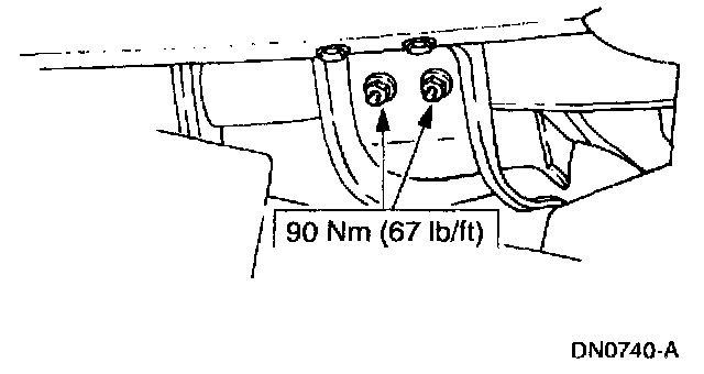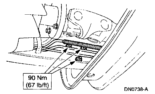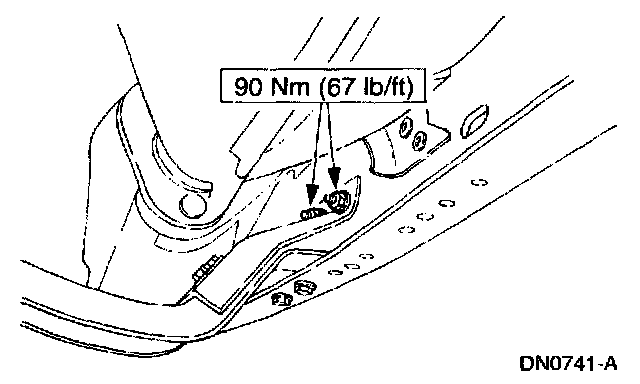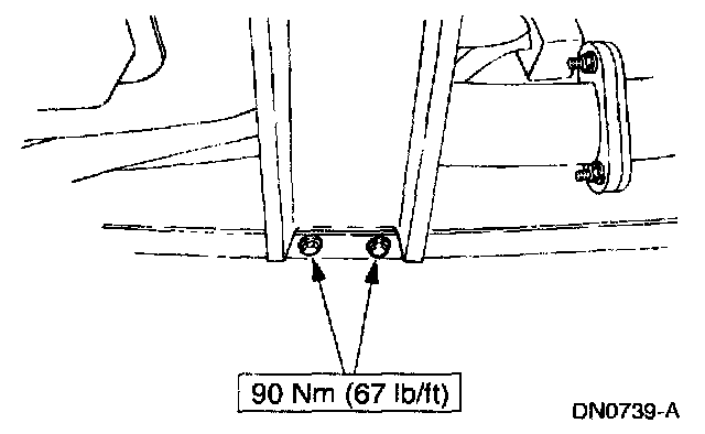 7. Tighten the transmission support crossmember nuts and bolts (RH side) to specification.