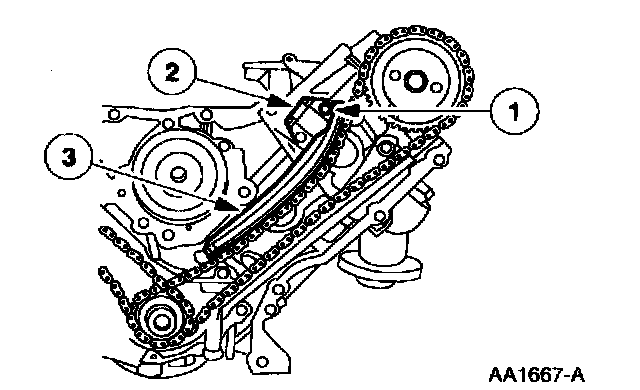 5. CAUTION: Unless otherwise instructed, at no time when the timing chain are removed and the cylinder heads are installed may the crankshaft or camshaft be rotated. Severe piston and valve damage will occur.