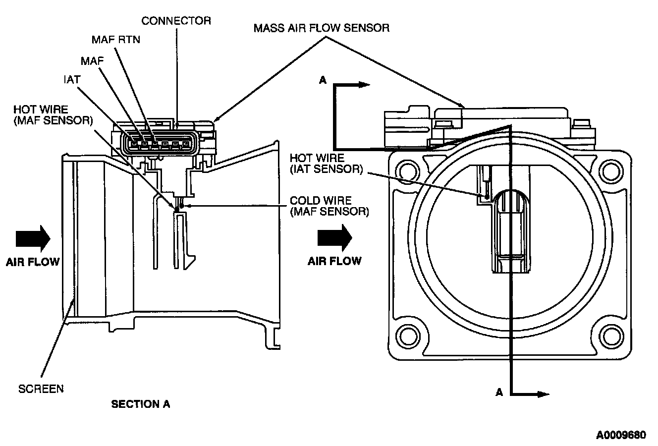 Diagram Of Air Flow Through Throttle Body Containing MAF Sensor Hot And Cold Wire (and IAT Sensor Where Applicable) Terminals: