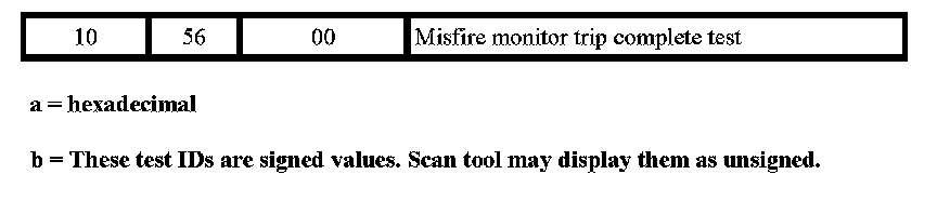 The purpose of this test mode is to allow access to the results of OBD II monitor diagnostic test results. The test values that are stored at the time of the particular monitor completion are displayed when the particular test identification is requested. Refer to the following table for test information.
