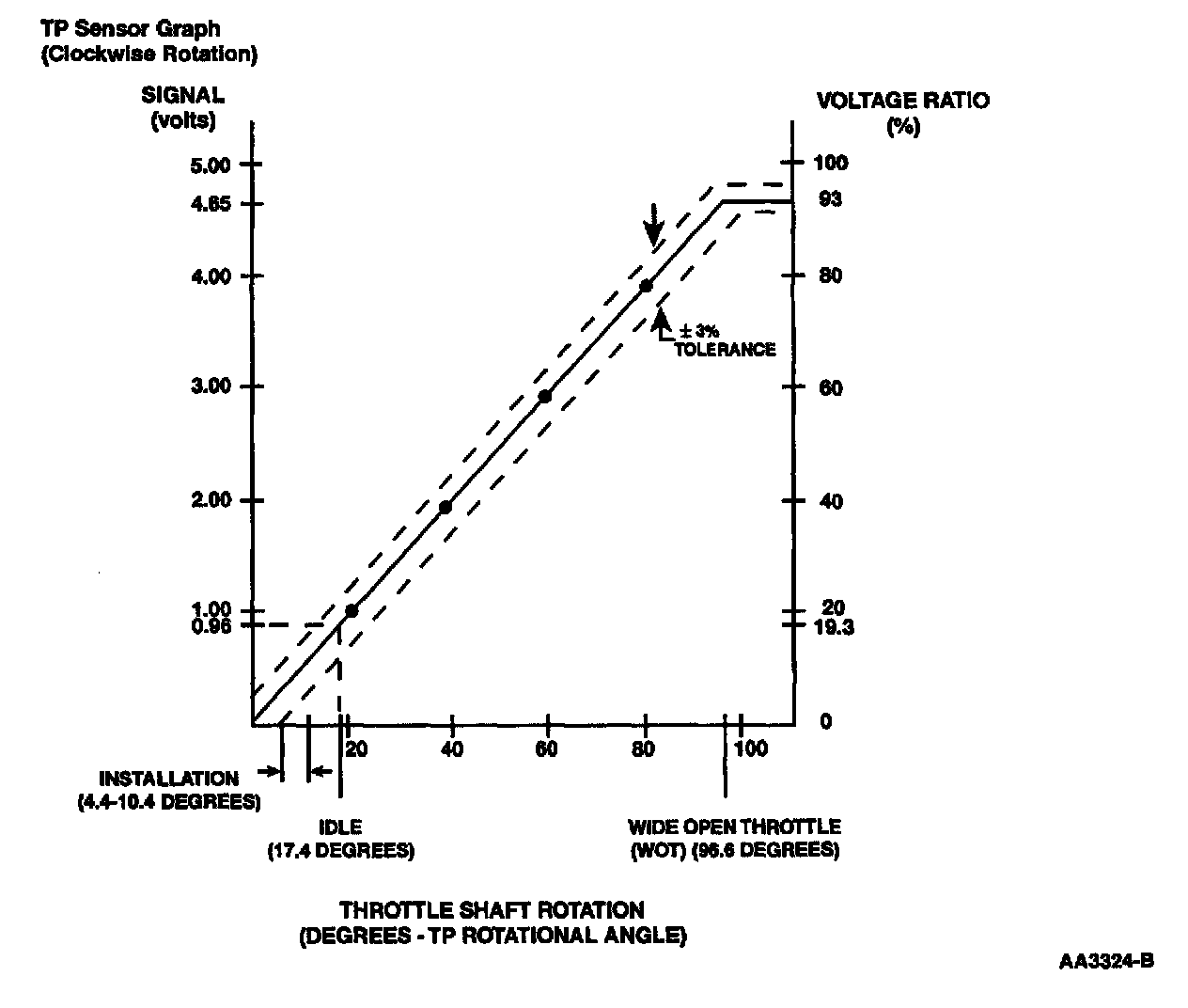NOTE: The normal range of the throttle angle measurement for the Throttle Position (TP) sensor is 0 to 96.6 degrees.