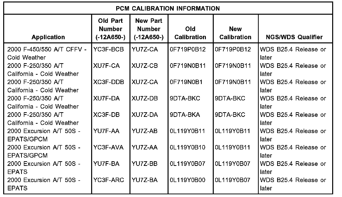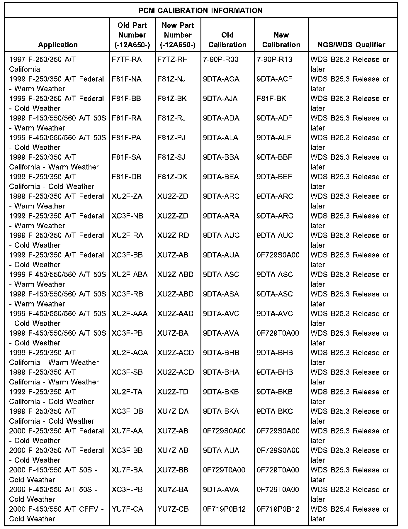 Reprogram the PCM. Refer to the PCM Calibration Information Chart shown for details.