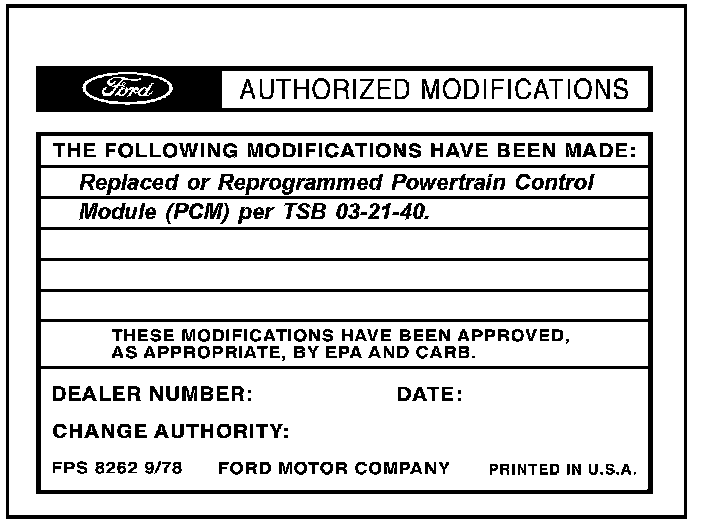 Obtain an Authorized Modifications Decal (FPS 8262 - obtainable through DOES II, 25/pkg) and list the date, dealer number, and summary of modifications performed. Select a prominent place adjacent to the Vehicle Emission Control Information Decal suitable for installing the Authorized Modifications Decal. Clean the area, install the decal, and cover it with a clear plastic decal shield.