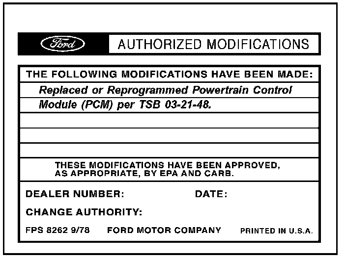 Obtain an Authorized Modifications Decal (FPS 8262 - obtainable through DOES II, 25/pkg) and list the date, dealer number, and summary of modifications performed. Select a prominent place adjacent to the Vehicle Emission Control Information Decal suitable for installing the Authorized Modifications Decal. Clean the area, install the decal, and cover it with a clear plastic decal shield.