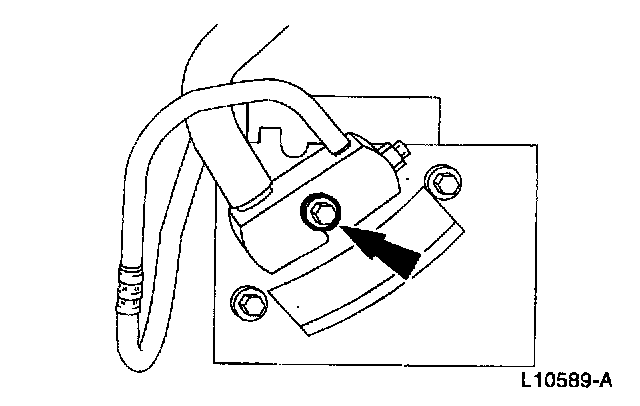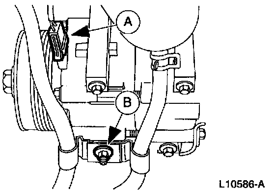 4. Disconnect the (A) A/C clutch electrical connector and remove the (B) power steering hose clamp nut.