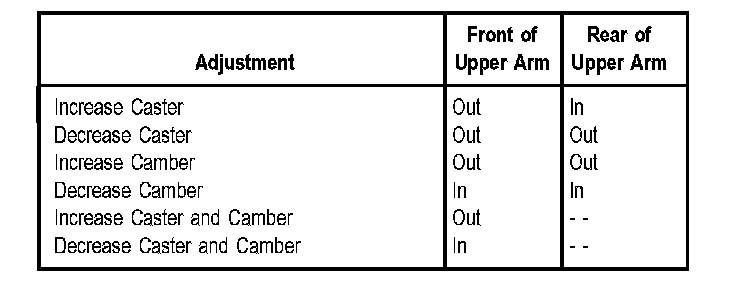 3. To adjust caster and camber refer to the chart. Adjustments that require moving the front and rear of the upper control arm should be made equally.