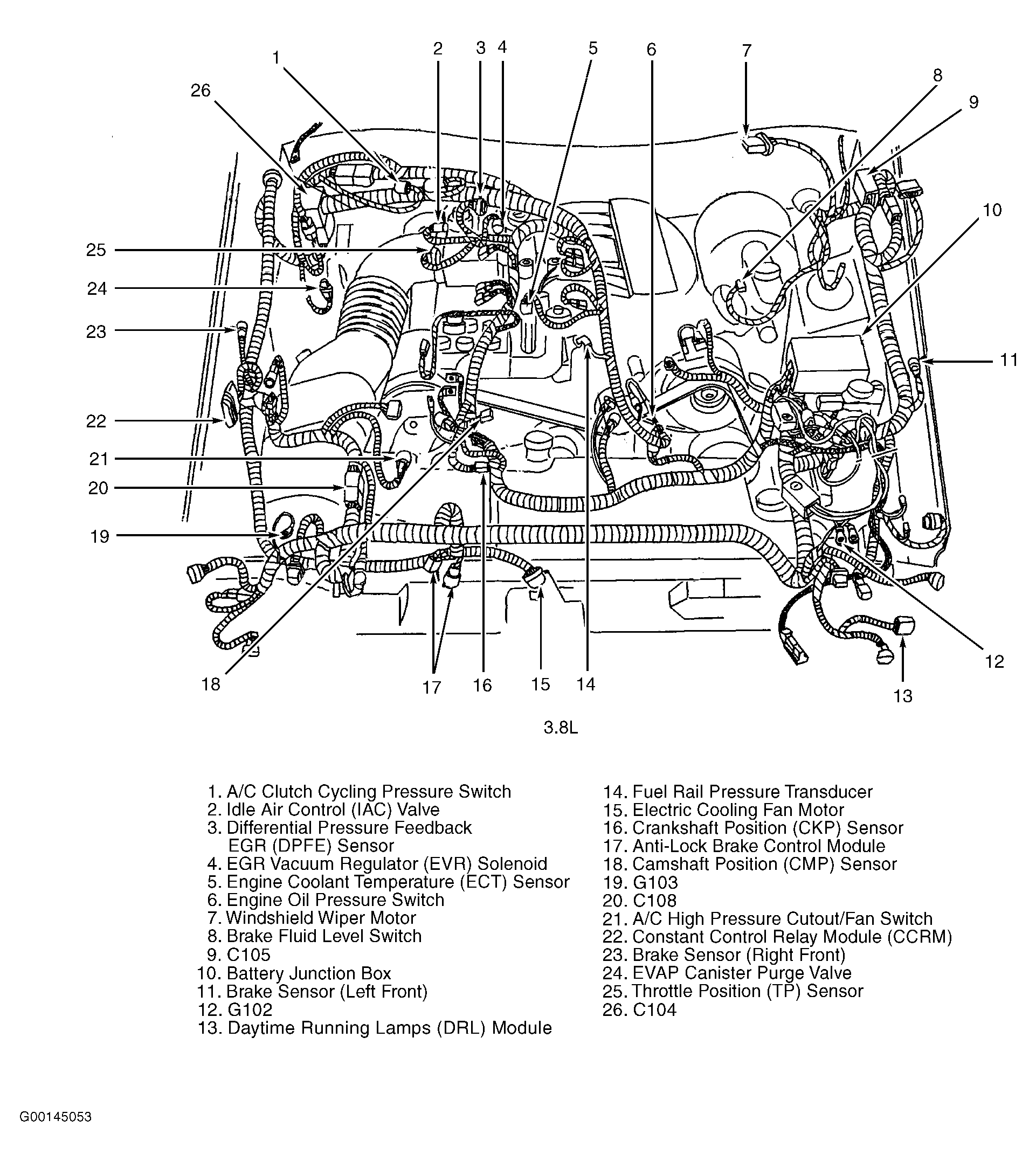 Daytime Running Lamps (DRL) Module (3.8L) In left front corner of engine compartment, below horns. See Figure.