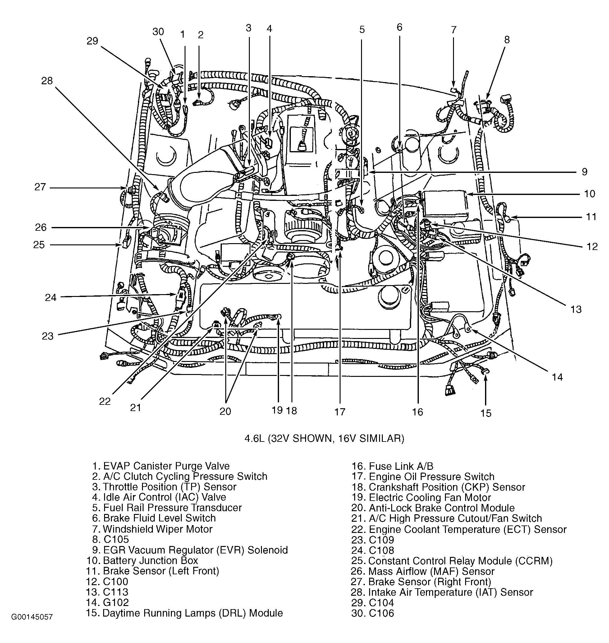 Daytime Running Lamps (DRL) Module (4.6L) In left front corner of engine compartment, below horns. See Figure.