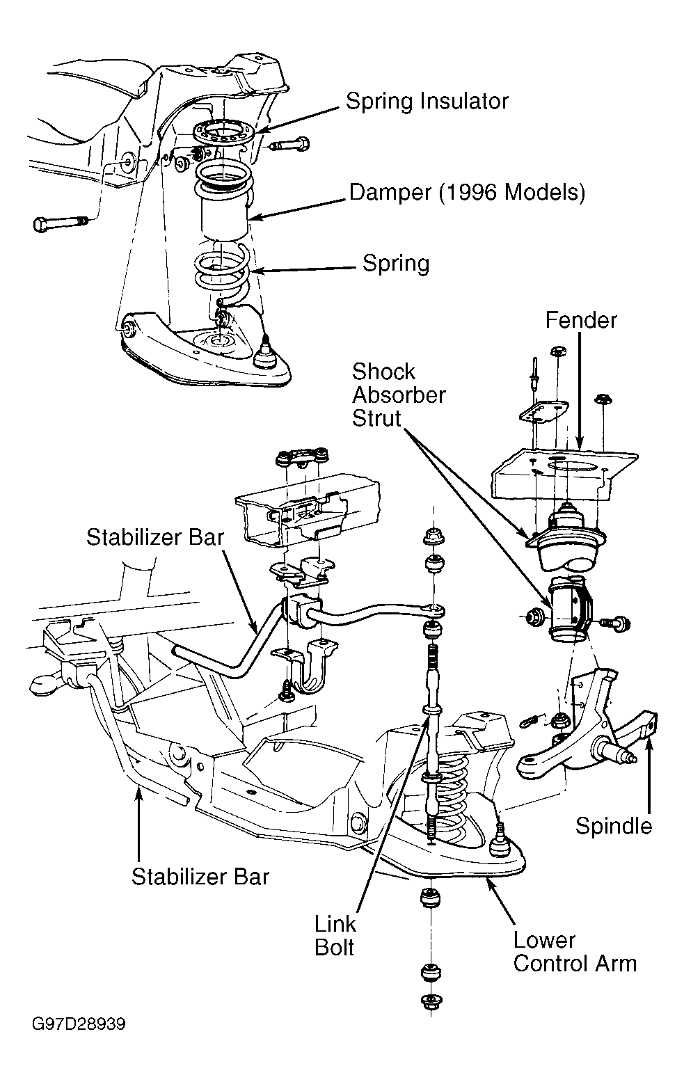 Front suspension is a modified MacPherson strut design. The design uses a damper, with coil spring located between lower control arm and a spring pocket in crossmember. Gas-pressurized hydraulic shock struts and a front stabilizer bar are used. See Fig 1.