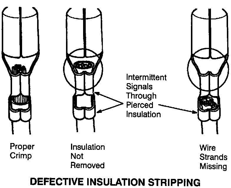 The following illustrations are known examples of wiring harness, splices and connectors that will create intermittent electrical concerns. The concerns are hidden and can only be discovered by a physical evaluation as shown in each illustration.