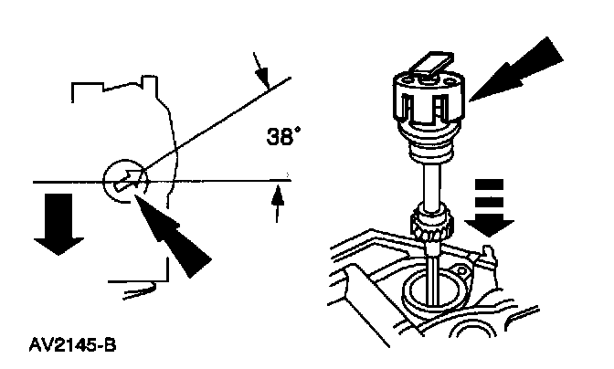 2. Install the camshaft synchronizer housing assembly so the arrow on the special tool is 38 degrees from the centerline of the engine.