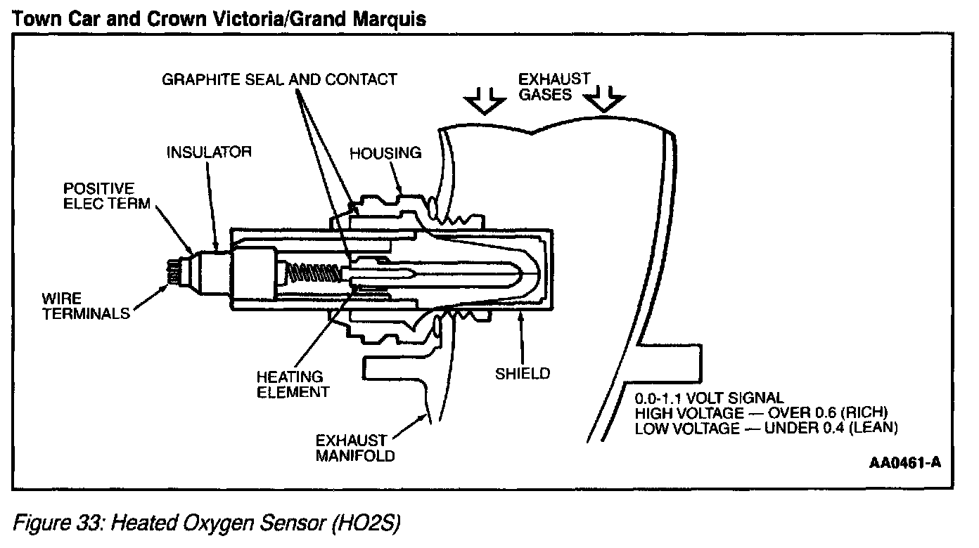 Heated Oxygen SensorThe Heated Oxygen Sensor (HO2S) detects the presence of oxygen in the exhaust and produces a variable voltage according to the amount of oxygen detected. A high concentration of oxygen (lean air/fuel ratio) in the exhaust produces a low voltage signal less than 0.4 volt. A low concentration of oxygen (rich air/fuel ratio) produces a high voltage signal greater than 0.6 volt. The HO2S provides feedback to the PCM indicating air/fuel ratio in order to achieve a near stoichiometric air/fuel ratio of 14.7:1 during closed loop engine operation. The HO2S generates a voltage between 0.0 and 1.1 volts.