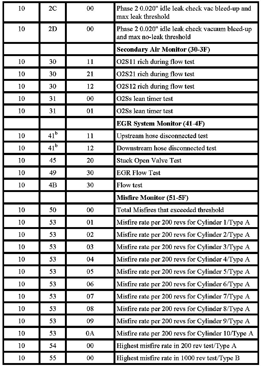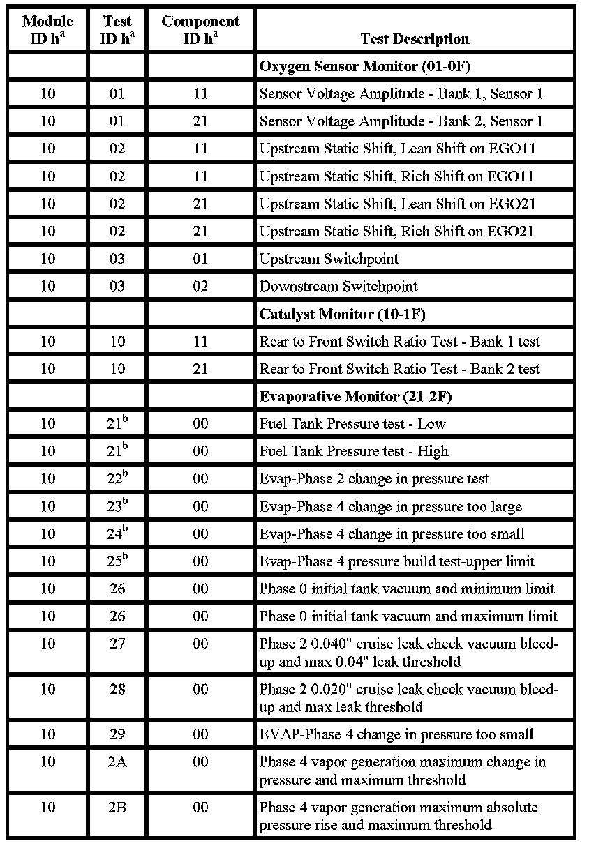 The purpose of this test mode is to allow access to the results of OBD II monitor diagnostic test results. The test values that are stored at the time of the particular monitor completion are displayed when the particular test identification is requested. Refer to the following table for test information.