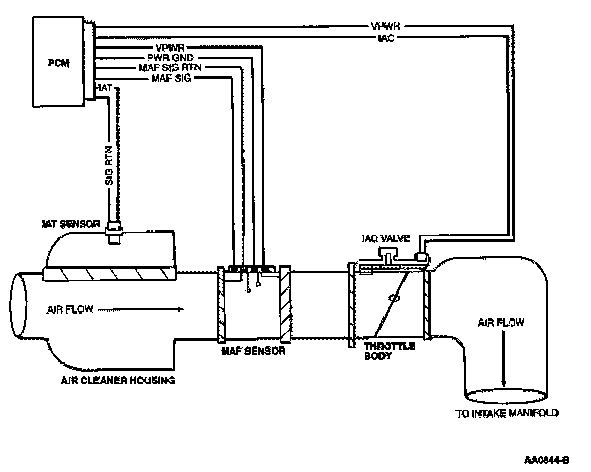 The Intake Air system (Figure 96) provides clean air to the engine, optimizes air flow and reduces unwanted induction noise. The Intake Air System consists of an air cleaner assembly, resonator assemblies and hoses. The main component of the intake air system is the air cleaner assembly. The air cleaner assembly houses the air cleaner element that removes potential engine contaminants, particularly abrasive types. The mass air flow (MAF) sensor is attached internally or externally to the air cleaner assembly and measures the quantity of air delivered to the engine combustion chamber. The MAF sensor can be serviced or replaced as an individual component. The intake air system also contains a sensor that measures the intake air temperature which may also be integrated with the MAF sensor. (Refer to Electronic EC Hardware - PCM Inputs for additional information on the MAF and IAT sensors.) Air induction resonators can be separate components or part of the intake air housing (i.e., conical air cleaner). The function of a resonator is to reduce induction noise. The air induction components are connected to each other and to the throttle body assembly with hoses.