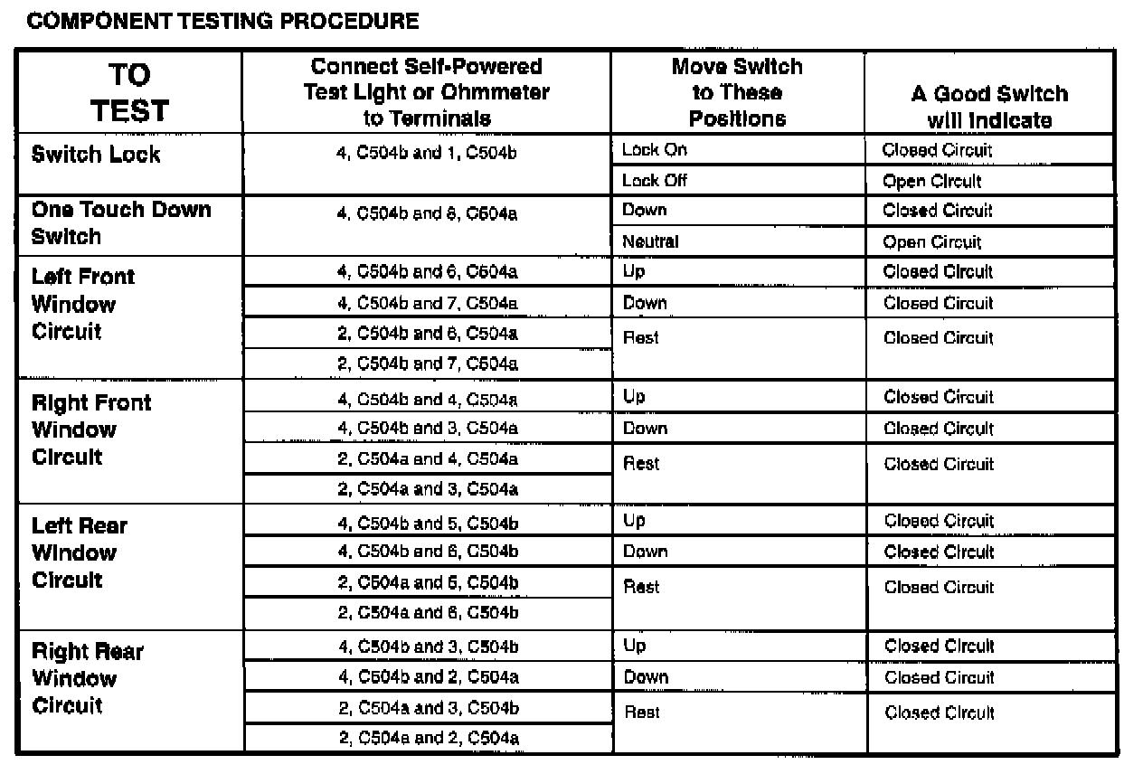 The component connector MUST BE REMOVED before testing. To test a single circuit within the component, select that circuit under the column TO TEST. If you wish to test the complete component, perform all tests.