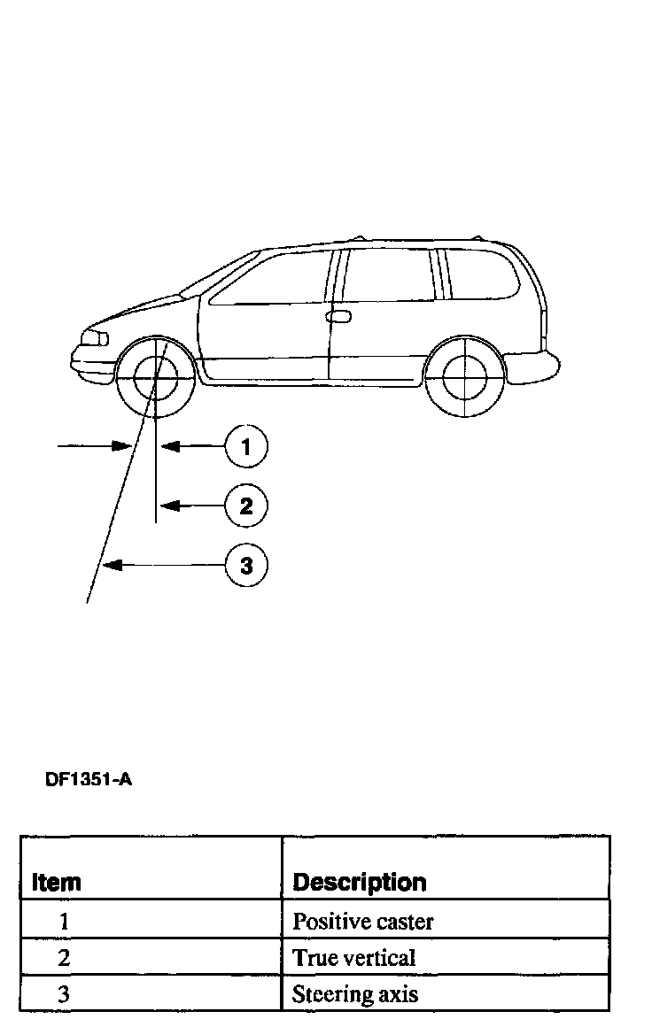 Caster is the deviation from vertical of an imaginary line drawn through the ball joints when viewed from the side. The caster specifications in this section will give the vehicle the best directional stability characteristics when loaded and driven. The caster setting is not related to tire wear.