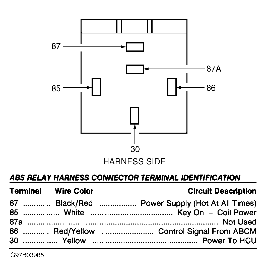 2. Disconnect ABS relay. Measure resistance between ABS relay harness connector terminal No. 87 (Black/Red wire) and ground. See Fig 1 . If resistance is greater than 10 k/ohms, replace ABS (60-amp) fuse and go to step  4 . If resistance is less than 10 k/ohms, repair Black/Red wire, and go to step  10 .