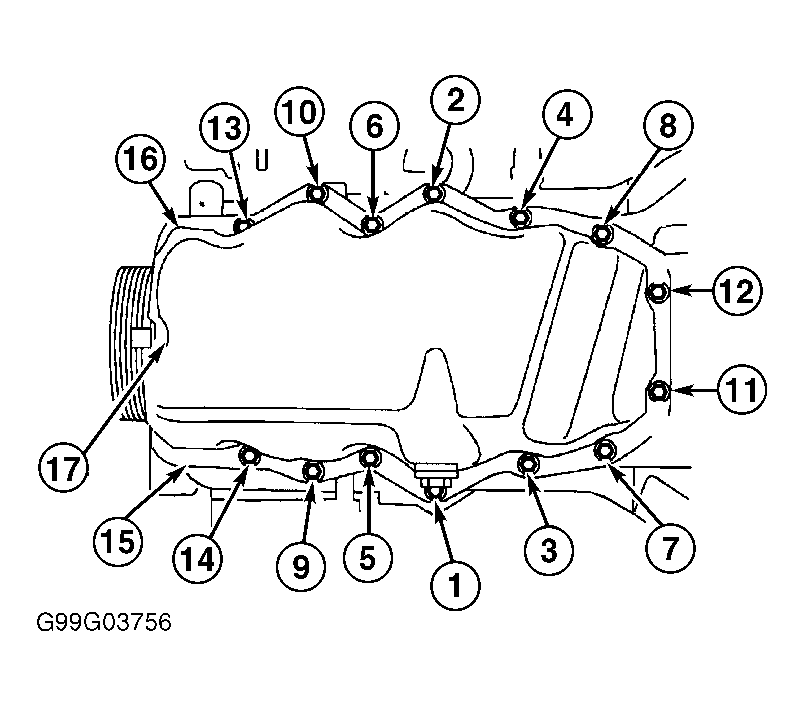 - Clean all sealant material from oil pan and cylinder block. Apply a continuous bead of silicone sealant to oil pan along inside of bolt holes. Install NEW oil pan gasket. Install oil pan and tighten bolts in sequence to specification. See Fig 1. See TORQUE SPECIFICATIONS .