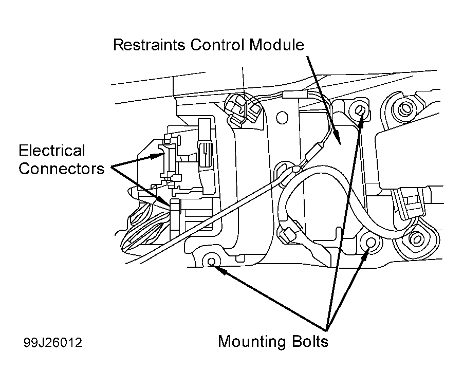 - Depress RCM harness connector locking tangs, slide locking bars back and disconnect electrical connectors from RCM. See Fig 1. Remove RCM mounting bolts and RCM.